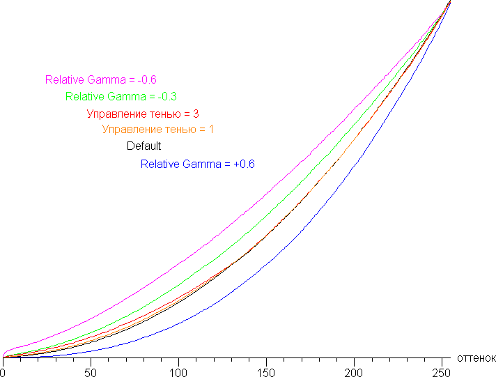 Различимость градаций в тенях можно немного повысить, увеличив значение настройки Управление тенью. Также различимость темных оттенков возрастает с уменьшением параметра Relative Gamma (завал в тенях на один оттенок пропадает), и снижается с его увеличением (и завал в тенях увеличивается).