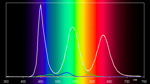По тому, насколько пики узкие, можно предположить, что в светодиодах подсветки применяется синий, зеленый и красный излучатель. Однако в описании монитора упоминается «технология квантовых точек», поэтому, возможно, применяется синий излучатель и зеленый и красный люминофоры на основе квантовых точек.