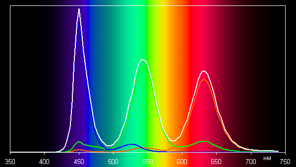 Ниже приведен спектр для белого поля (белая линия), наложенный на спектры красного, зеленого и синего полей (линии соответствующих цветов), когда нет корректировки цветового охвата