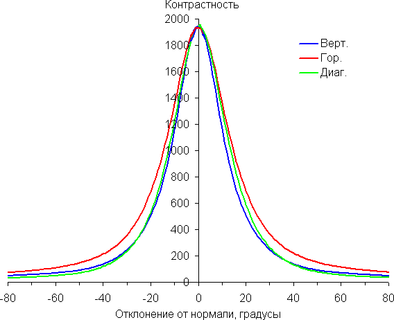 По скорости падения яркости углы обзора не очень широкие. Отметим примерно одинаковый характер уменьшения яркости при отклонении от перпендикуляра к экрану во всех трех направлениях, при этом графики не пересекаются во всем диапазоне измеряемых углов. При отклонении в диагональном направлении яркость черного поля достигает большего значения, чем в двух других случаях. Однако максимум яркости черного поля все равно меньше, чем в случае типичного монитора на матрице IPS. Контрастность в диапазоне углов ±82° приближается к отметке 10:1 только при отклонении по диагонали, но все равно остается существенно выше этого значения.