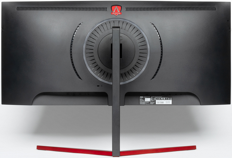 По центру фронтальной планки красной краской нарисован логотип Agon — это марка компании AOC для игровых мониторов премиального класса, а уже на нижнем торце блока экрана есть 5-позиционный джойстик, выполненный из прозрачного пластика.