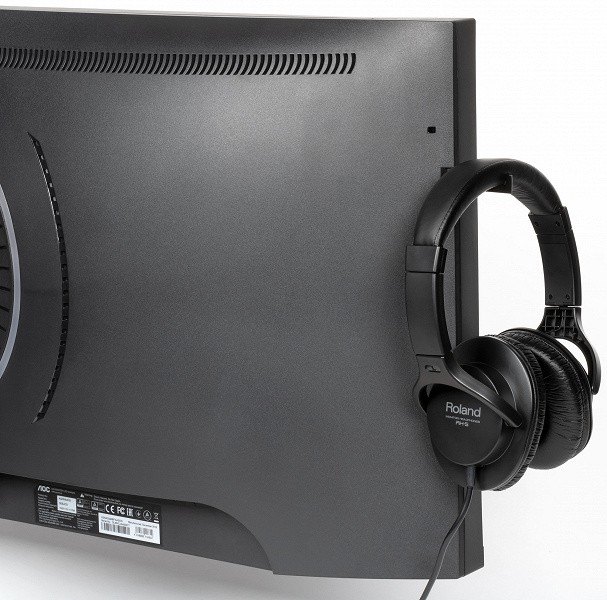Все интерфейсные разъемы и разъем питания расположены в двух незамкнутых нишах на задней панели и ориентированы вниз. Кабели, идущие от разъемов монитора, можно зафиксировать с помощью двух клипс с клейкой поверхностью. Куда именно эти клипсы приклеить, решает сам пользователь, от производителя рекомендаций нет. На задней панели и на нижнем торце есть несколько вентиляционных решеток. Где-то внутри блока монитора находится как минимум один вентилятор, который помогает охлаждать электронику монитора.