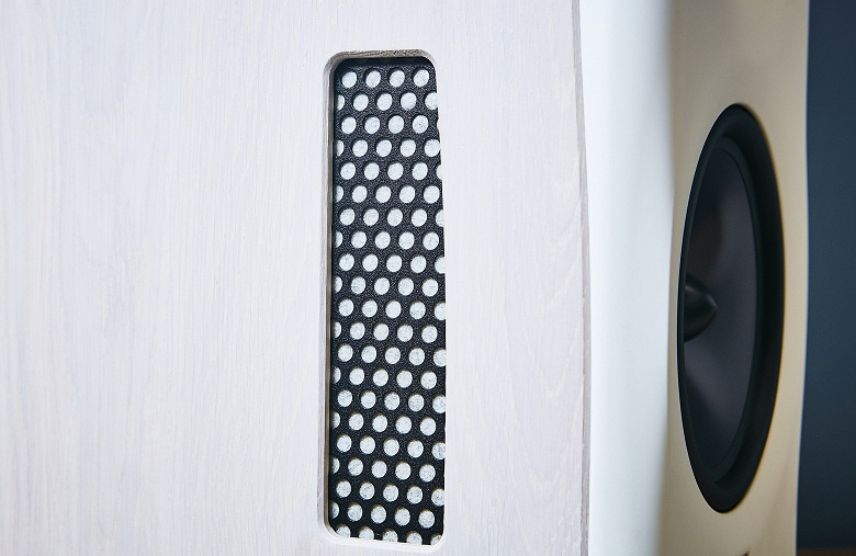 В верхней части панели мы видим глубокий волновод, внутри которого находится купольный твитер из алюминиево-магниевого сплава диаметром 25 мм. Такое размещение излучателя помогает разительно повысить эффективность ВЧ-динамика, а заодно согласовать его направленность со среднечастотным «коллегой».