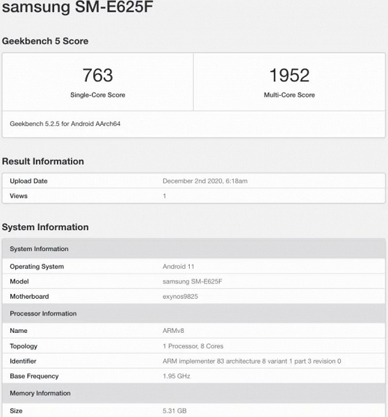 Перспективный смартфон засветился в базе бенчмарка Geekbench под каталожным номером SM-E625F, благодаря чему стали известны его ключевые параметры. И хороших новостей тут сразу две. Во-первых, в качестве ОС фигурирует Android 11. Это значит, что, покупая смартфон, пользователь из коробки получит самую актуальную версию операционной системы. Во-вторых, в качестве аппаратной платформы используется далеко не слабая Exynos 9825. Эта SoC, напомним, применяется во флагманах 2019 года Samsung Galaxy Note 10 и Galaxy Note 10+. Что касается объема оперативной памяти, то он составил вполне типичные для среднеуровневой модели 6 ГБ.