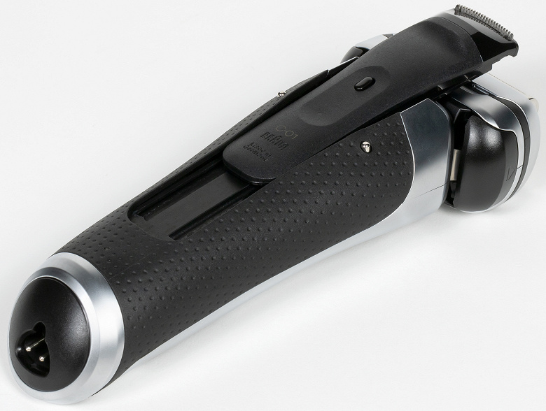 По центру расположен выдвижной триммер с кнопкой фиксации, по бокам — два контакта (для работы с «продвинутыми» док-станциями). На триммере помимо кнопки мы видим логотип Braun и надпись «Made in Germany).