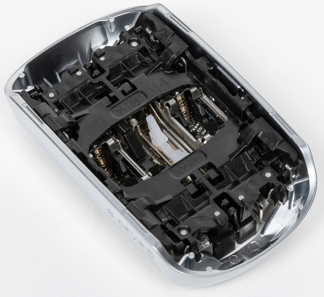Рассмотрев ножевой блок, мы увидели две бритвенные сетки OptiFoil (по краям), триммер Direct & Cut, срезающий волоски, растущие в разные стороны, а также второй триммер Lift & Cut — с титановым покрытием (он предназначен для срезания волосков, прилегающих к коже).
