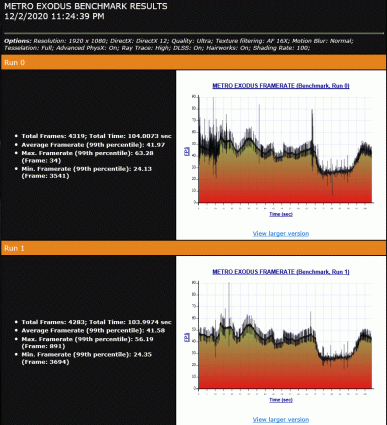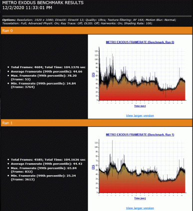 В тихом и сбалансированном режимах видеокарта Nvidia GeForce RTX 2060 работает на одинаковой частоте GPU 1,4 ГГц при потреблении в пределах 80 Вт и температурах 63-65 °C. Однако в игровом режиме частота GPU видеокарты повышается до 1,55-1,6 ГГц при 100-ваттном потреблении, а температура возрастает до 69 °C, даже несмотря на более высокую скорость вентиляторов и уровень шума.