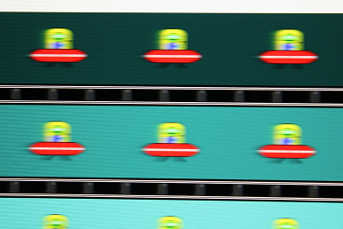 Для наглядного представления о том, что означает такая скорость матрицы на практике, приведем серию снимков, полученных с помощью движущейся камеры. Такие снимки показывают, что́ видит человек, если он следит глазами за двигающимся на экране объектом. Описание теста приведено тут, страница с самим тестом тут. Использовались рекомендованные установки (скорость движения 960 пикселей/с), выдержка 1/15 с.