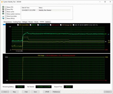 Самое время проверить, что изменяется в работе процессора и видеокарты ноутбука при активации этих режимов. Для первого мы использовали стресс-тест FPU из утилиты AIDA64 Extreme (инструкции AVX были задействованы). Температура в помещении во время теста держалась у отметки 25 °C. Сначала мы протестировали ноутбук с подключенным адаптером питания. Стресс-тест CPU при питании от электросети: