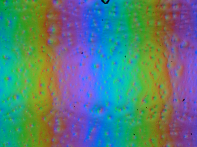 Зерно этих дефектов в несколько раз меньше размеров субпикселей (масштаб этих двух фотографий одинаковый), поэтому фокусировка на микродефектах и «перескок» фокуса по субпикселям при изменении угла зрения выражены слабо, из-за этого нет и «кристаллического» эффекта.
