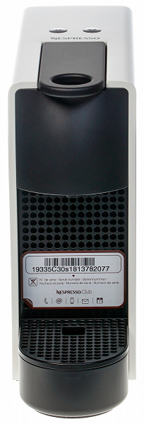 Визуальное изучение кофемашины оказалось не слишком долгим. На дне мы обнаружили резиновые ножки, препятствующие скольжению прибора по поверхности стола, и наклейку с технической информацией. Места для хранения излишков и без того не слишком длинного (75 см) кабеля у машинки не предусмотрено.
