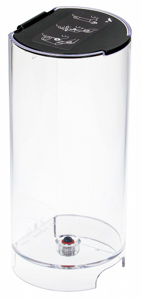Сама емкость сделана из прозрачного пластика. Снизу по центру резервуара можно увидеть клапан подачи воды. Сверху расположена откидная пластиковая крышка, выполняющая по совместительству роль крепления резервуара к корпусу кофеварки (защелки). Объем его составляет 0,6 литра.