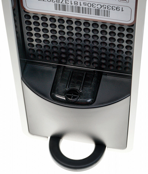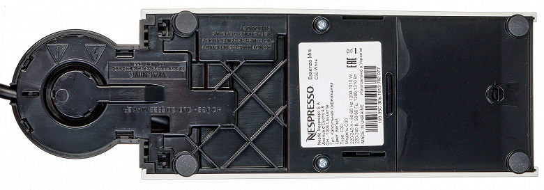 Визуальное изучение кофемашины оказалось не слишком долгим. На дне мы обнаружили резиновые ножки, препятствующие скольжению прибора по поверхности стола, и наклейку с технической информацией. Места для хранения излишков и без того не слишком длинного (75 см) кабеля у машинки не предусмотрено.