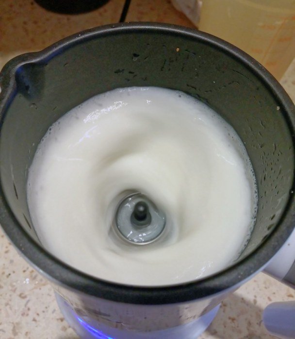 Холодное молоко за 1,5 минуты увеличилось в объеме в 2 раза, пена была мелкопузырчатая и занимала примерно 60% стакана, однако после манипуляций с переливанием начала довольно быстро опадать.