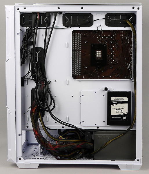 Глубина отсека для прокладки проводов составляет около 25 мм у задней стенки. Это вполне прилично, и не только для бюджетного корпуса. Для монтажа проводов предусмотрены петли для крепления стяжек или других аналогичных изделий. В монтажных отверстиях на основании для системной платы имеются лепестковые мембраны из резиноподобного материала, также монтажные отверстия для прокладки проводов есть в кожухе блока питания, но мембран там уже нет.