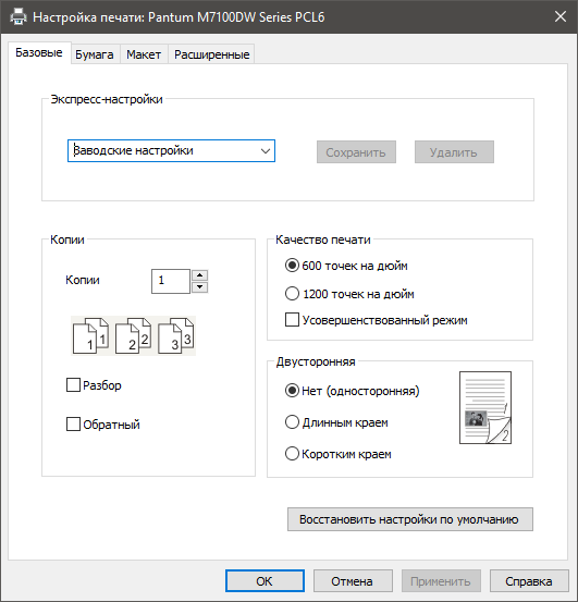 На первой задаются основные параметры: одно- или двусторонняя печать, количество и способ разбора комплектов, а также разрешение — 600 или 1200 dpi, есть еще усовершенствованный режим, который инструкция именует «Точный режим печати» и рекомендует для печати инженерных чертежей и других документов с тонкими линиями. Набор установок можно сохранить с понятным названием, чтобы быстро вызывать при необходимости.
