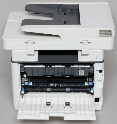 Над выдвижным лотком имеется откидная крышка, открывающая доступ к месту установки тонер-картриджа и блока фотобарабана. В правом верхнем углу этой крышки расположена кнопка Power с подсветкой при включении, которая заодно показывает и состояние — мерцает при переходе в режим энергосбережения.
