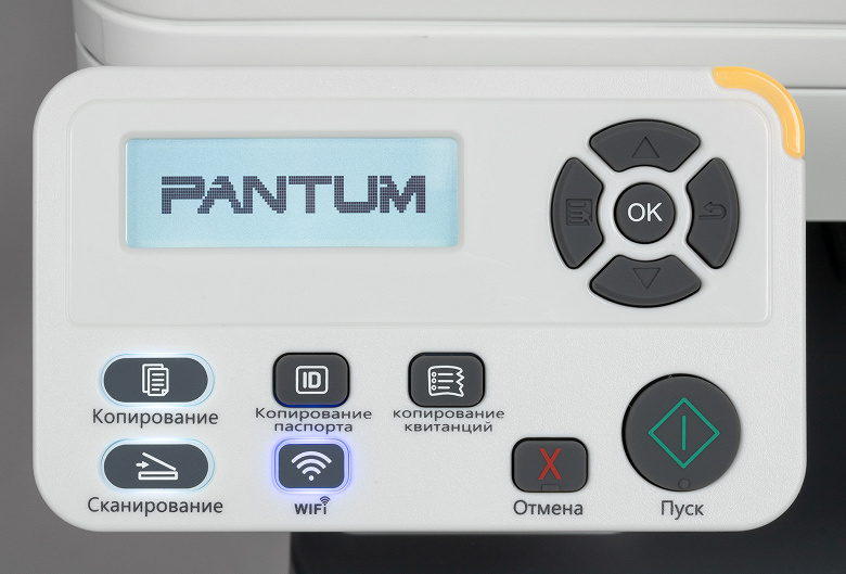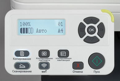 Панель управления состоит из двух частей, в верхней расположен двухстрочный монохромный ЖК-дисплей с диагональю 4,8 см (по нашему замеру) и яркой белой подсветкой, справа от него пятикнопочный навигационный блок. В нижней части находятся кнопки выбора режимов копирования и сканирования (обе с индивидуальной белой подсветкой, показывающий текущий режим), настройки беспроводной сети (синяя подсветка), есть отдельные кнопки для копирования паспорта и квитанций (без подсветки), а также «Отмена» и «Пуск» (самая крупная, круглая).