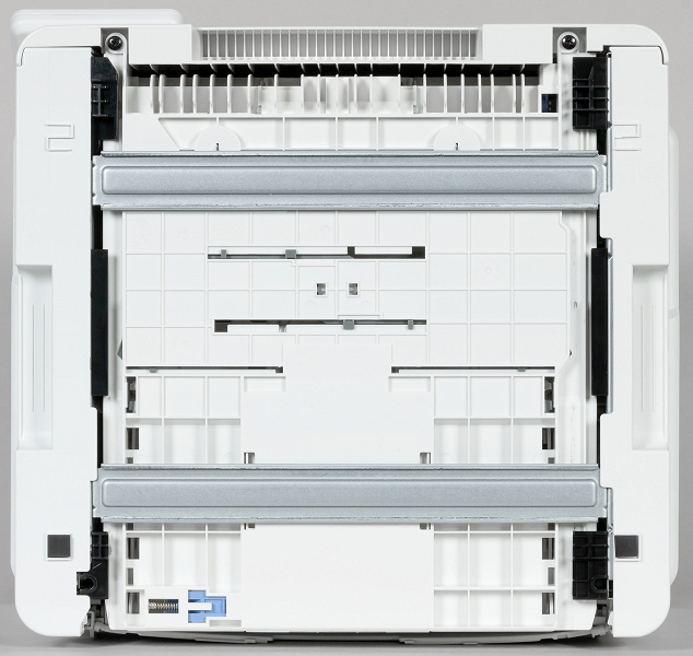 Среднюю часть задней стенки занимает еще одна откидная крышка, скрывающая доступ к механизмам принтера. Хотя в инструкции подобной информации мы не нашли, но зачастую у этой крышки есть и еще одна функция: прием отпечатка, сделанного на плотном листе или конверте. Дело в том, что при выводе в основной приемный лоток изгиб носителя близок к 180 градусам, что не всегда допустимо; при использовании лотка ручной подачи и выводе назад изгиб гораздо меньше, вот только носители придется подавать по одному, да еще потребуется дополнительное место позади аппарата.