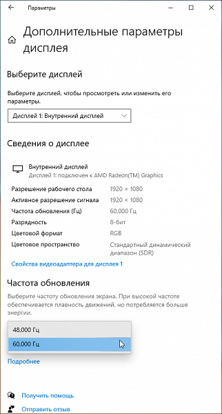 В настройках экрана доступны две частоты обновления — 60 и 48 Гц. Вторая может пригодится при просмотре кинофильмов. По крайней мере, при родном разрешении экрана вывод идет с глубиной цвета 8 бит на цвет.