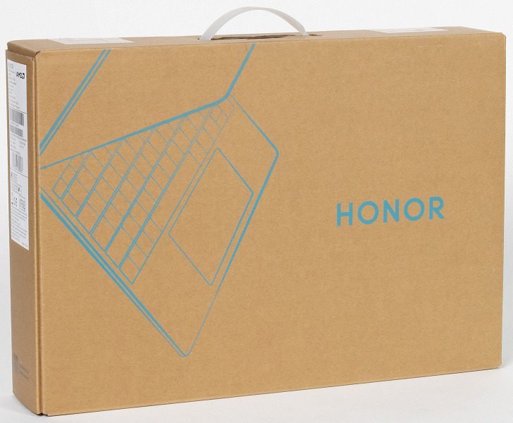 Коробка MagicBook 14 NMH-WDQ9HN точно такая же по оформлению, как у других ноутбуков Honor, не считая премиальные версии с литерой «s». Пожалуй, компании пора уже как-то разводить свои мейнстримовые продукты по оформлению упаковок, так покупателям будет удобнее, учитывая количество выпускаемых Honor моделей.