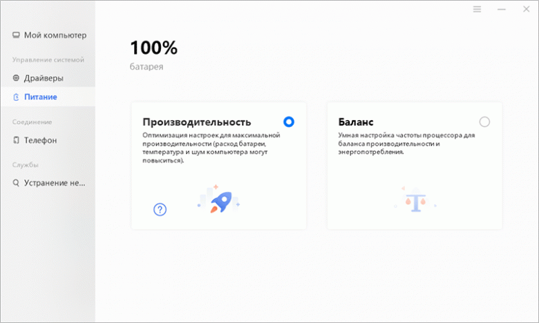 При работе от адаптера питания у ноутбука доступен выбор из двух режимов: производительного и сбалансированного. Они переключаются либо сочетанием клавиш Fn+P на клавиатуре, либо через установленное программное обеспечение.
