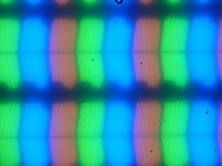 В этом ноутбуке используется матрица типа IPS. Микрофотографии демонстрируют типичную для IPS структуру субпикселей (черные точки — это пыль на матрице фотоаппарата):