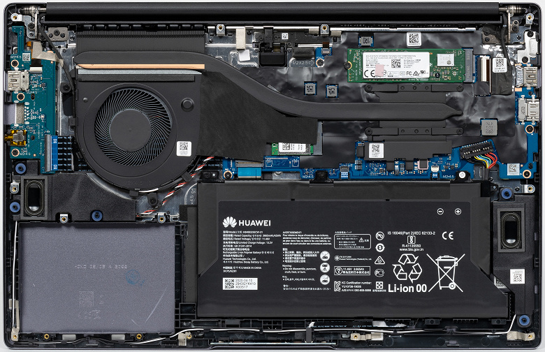 Увеличенные размеры корпуса Honor MagicBook 15 позволили разработчикам немного «поиграть» с его внутренней компоновкой. В сравнении с «четырнадцатым» сразу же обращает на себя внимание короткий аккумулятор и свободное пространство под размещение 2,5-дюймовго накопителя. Также отметим, что немного выросла в размерах система охлаждения, что немаловажно для обеспечения эффективности.