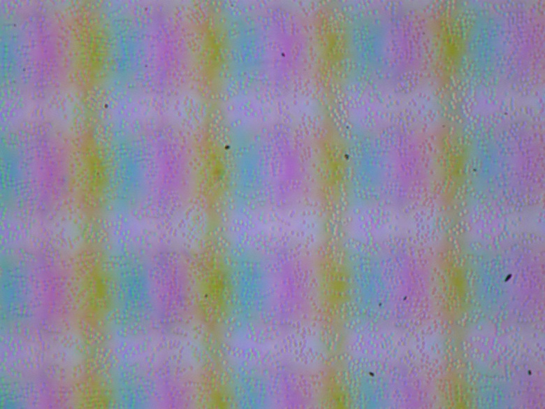 Зерно этих дефектов в несколько раз меньше размеров субпикселей (масштаб этих двух фотографий примерно одинаковый), поэтому фокусировка на микродефектах и «перескок» фокуса по субпикселям при изменении угла зрения выражены очень слабо, из-за этого нет и «кристаллического» эффекта. То, что матрица под стеклом на самом деле слегка матовая, ухудшает антибликовые свойства из-за диффузного отражения.