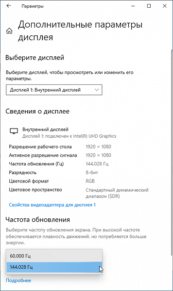 В настройках экрана на выбор доступны две частоты обновления — 60 и 144 Гц. По крайней мере, при родном разрешении экрана вывод идет с глубиной цвета 8 бит на цвет.