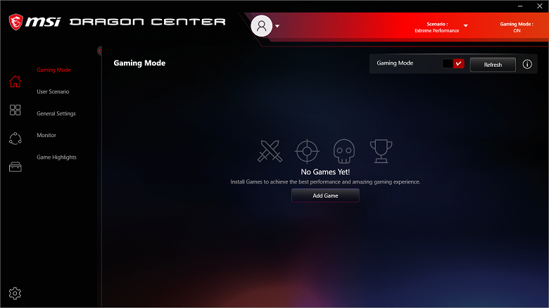 В фирменном приложении MSI Dragon Center профиль Extreme Performance соответствует первой опции на вкладке User Scenario. Внизу, в описании, указано очевидное: это режим высокой мощности, предназначенный для игр.