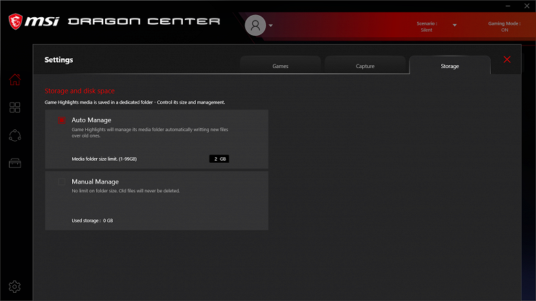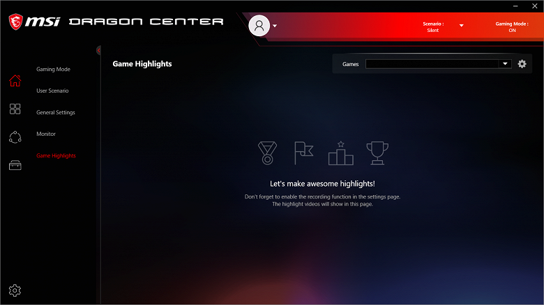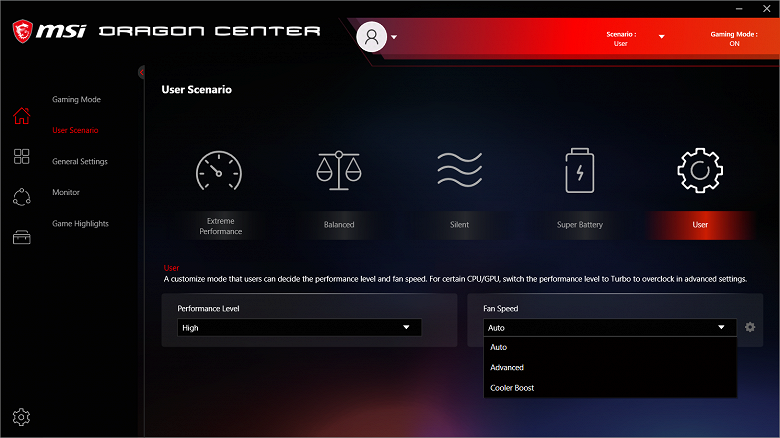 Ноутбук поставляется с Windows 10 Home, фирменными утилитами MSI Dragon Center, MSI Companion и Nahimic. Главной функцией фирменной утилиты Dragon Center является выбор сценария работы комплектующих и системы охлаждения. Всего предлагается 4 готовых пресета с очевидными названиями, а также пользовательский сценарий.
