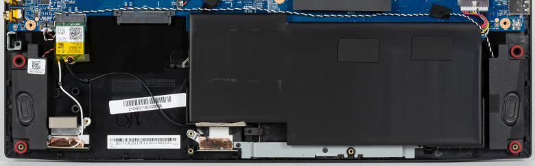 Чтобы снять нижнюю панель корпуса, нужно открутить 12 винтов крестовой отверткой. Это открывает доступ к начинке ноутбука. Система охлаждения и батарея относительно компактные.