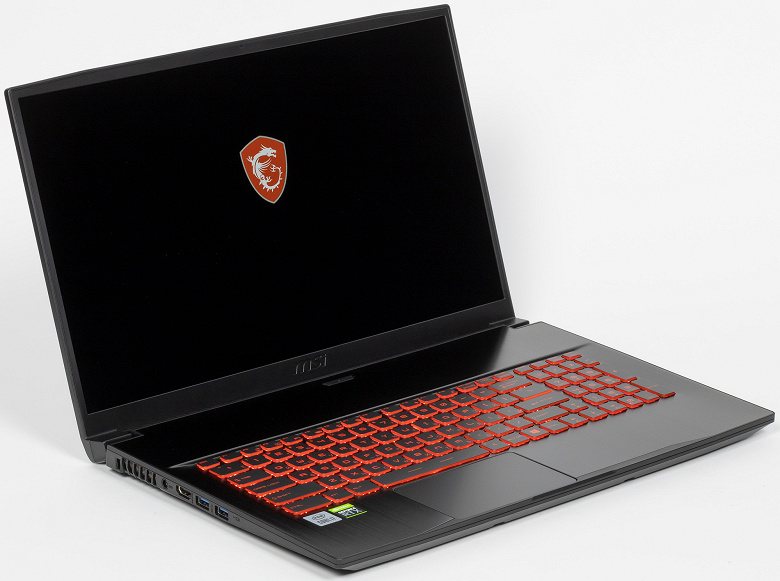 Герой нашего сегодняшнего обзора назван тонким не в насмешку, а совершенно справедливо. Разумеется, с ультрабуками его сравнивать нельзя, однако в данном случае речь идет не о сверхкомпактных моделях, а об игровых портативных ПК, и в этом классе, среди игровых ноутбуков с 17-дюймовыми экранами, MSI GF75 Thin 10UD-045XRU действительно оказывается одним из самых тонким и одним из самых легких. Итак, перед нами 17-дюймовый ноутбук — на это указывает первая цифра в индексе (GF75). Он оснащен процессором Intel Core 10-го поколения (прошлогодним) — об этом говорят первые две цифры суффикса после слова Thin, —, а также дискретным видеоускорителем Nvidia GeForce RTX 3050 Ti Laptop, анонсированным 11 мая 2021 г. как бюджетное геймерское решение. Это, как принято говорить, модель начального уровня; по спецификациям и производительности она уступает другим Nvidia GeForce RTX 30 Laptop: всего 4 ГБ видеопамяти, меньшее число ядер CUDA, тензорных (Tensor AI) и трассировочных (RT). Но и стоимость Nvidia GeForce RTX 3050 Ti Laptop должна быть существенно ниже всех других видеокарт Nvidia GeForce RTX тридцатой серии, а это дает возможность производителям понизить цены геймерских ноутбуков. Подробнее об этом см. в нашем материале. В общем, ноутбук интересный. Дополнительные сведения о нем можно почерпнуть на веб-сайте производителя. Мы с удовольствием взялись за испытания, результаты которых представляем в настоящем обзоре. Начнем наше знакомство, как водится, со спецификаций.