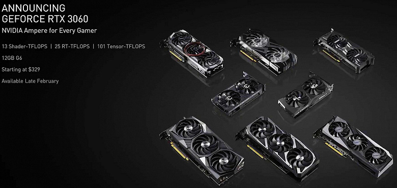О том, что Nvidia не планирует выпуск GeForce RTX 3060 Founders Edition, свидетельствуют слайды, которые использовались при анонсе карты. На них карта референсного дизайна отсутствует.