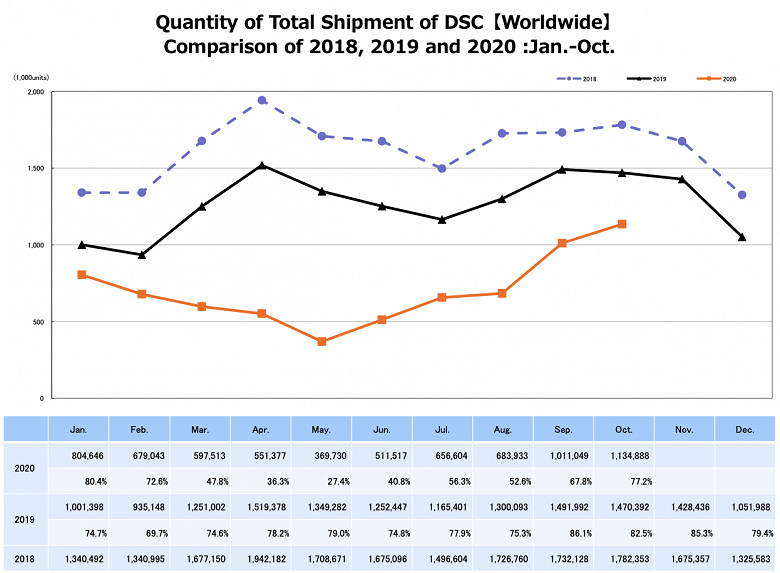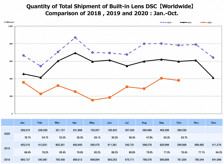 Компактных камер в октябре было продано 380 230 штук, что равно 63,7% показателя за октябрь прошлого года. Примечательно, что движение на графике относительно сентября точно повторило движение в предыдущие годы.