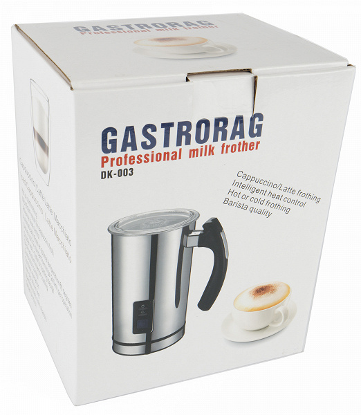 Подогреватель и вспениватель молока Gastrorag DK-003 — это профессиональное (по крайней мере, так написано на коробке) устройство, позволяющее быстро и легко приготовить горячее молоко, а также горячую либо холодную молочную пену для напитков на основе кофе. С помощью такого устройства мы сможем приготовить капучино, латте, макиато, капучино со льдом, латте макиато и т. п.