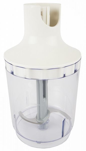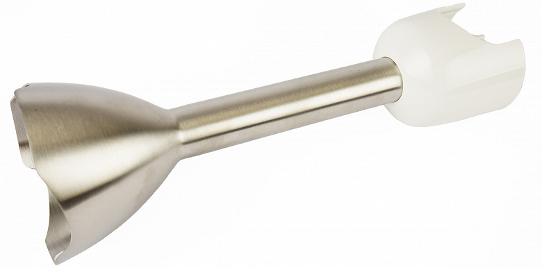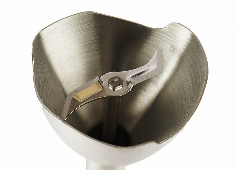 Погружная насадка выполнена из нержавеющей стали и пластика, стальной нож закреплен на оси, расположенной внутри насадки.