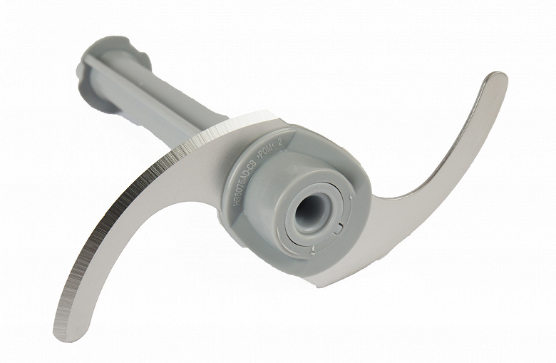 У ножа две лопасти, каждая из которых имеет остро заточенный изогнутый край. Кончики лопастей слегка загнуты вниз. Вокруг ножей насадка образует купол с неровными краями для наименьшего количества брызг.