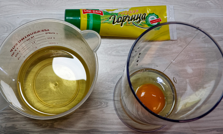 Для приготовления домашнего майонеза мы пользуемся следующей пропорцией ингредиентов: на 250 мл растительного масла берем одно яйцо, половину чайной ложки соли, одну чайную ложку сахара, столовую ложку уксуса и одну чайную ложку горчицы.