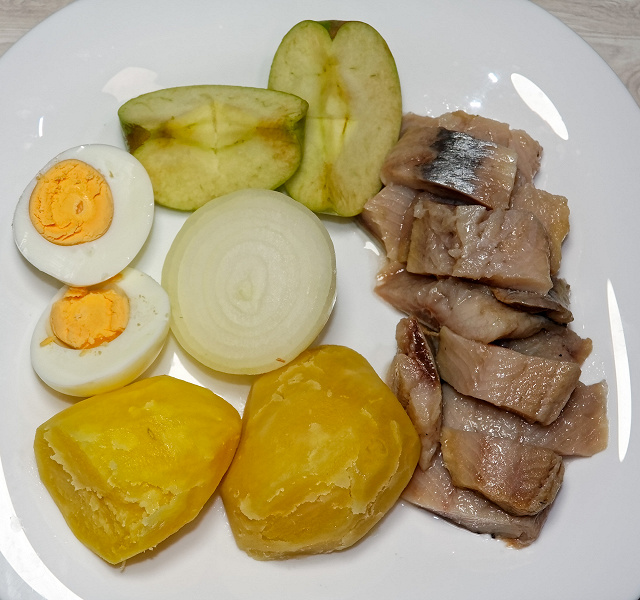 Для этого теста мы взяли селедку, сваренные вкрутую яйца, свежее яблоко, вареный картофель и репчатый лук.