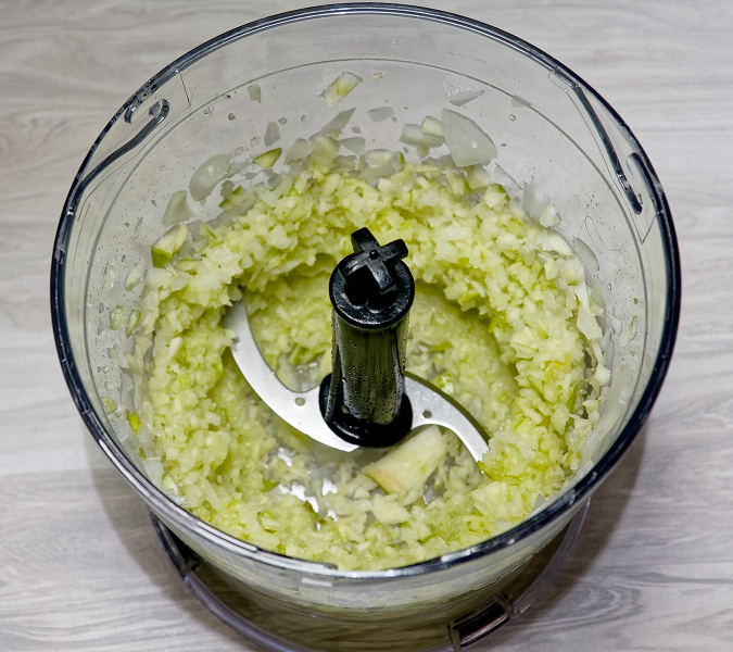 Измельчать начали с твердых ингредиентов — яблока и лука. Результатом остались в целом довольны: крупных кусочков в чаше практически не было обнаружено.