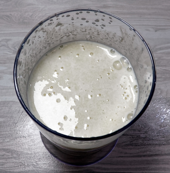 Ингредиенты мы предварительно нарезали на кусочки подходящего размера и поместили в стакан для измельчения. Затем добавили молоко, оставив безопасное расстояние до краев стакана и начали измельчать.