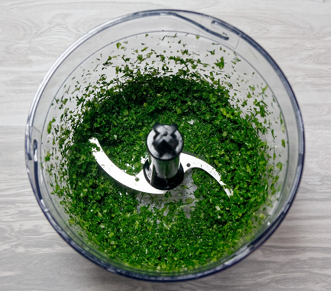 Затем добавили все остальные ингредиенты и продолжили измельчение, периодически встряхивая содержимое чаши. Наша цель была — получить однородное пюре, поэтому мы измельчали содержимое чаши 40–45 секунд.