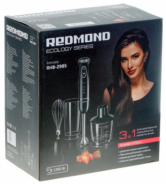 Блендерные наборы типа 3 в 1 мы тестируем довольно часто, и с точки зрения конструкции герой нашего сегодняшнего обзора не особо выделяется. Разработчик (компания Redmond) в качестве основных «фишек» своего нового блендера RHB-2985 отмечает увеличенный ресурс работы, низкий уровень шума и двойную защиту двигателя (что подразумевает остановку как при перегрузке, так и при перегреве).
