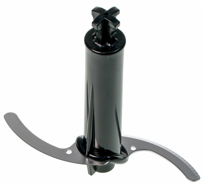 Насадка-блендер, сделанный из пластика (в месте стыковки) и нержавеющей стали, выглядит стандартно. Внимание привлекает, разве что, слегка необычная форма защиты ножей (с прорезями) и не слишком большая рабочая глубина насадки. Нож у нашего блендера двухлопастной, слегка загнутый по краям.