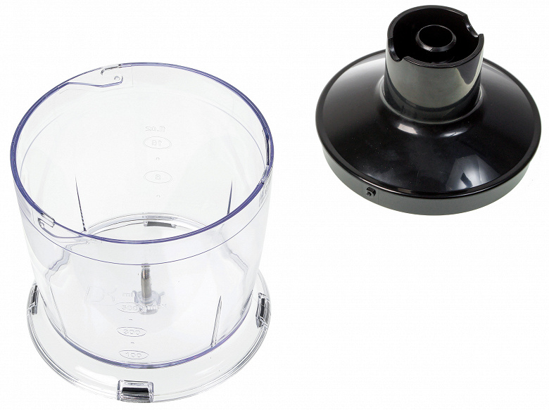 А вот чаша измельчителя выглядит куда более солидно. Пластик у нее такой же прозрачный и царапающийся, но более толстый. На дне присутствуют резиновые антискользящие вставки. На стенках нанесена градуировка — от 100 до 500 мл с шагом в 100 мл, а также отметки от 4 до 16 унций с шагом в 4 унции. Точно отмерить нужное количество продуктов с их помощью вряд ли получится, но примерное представление об объеме содержимого получить можно.