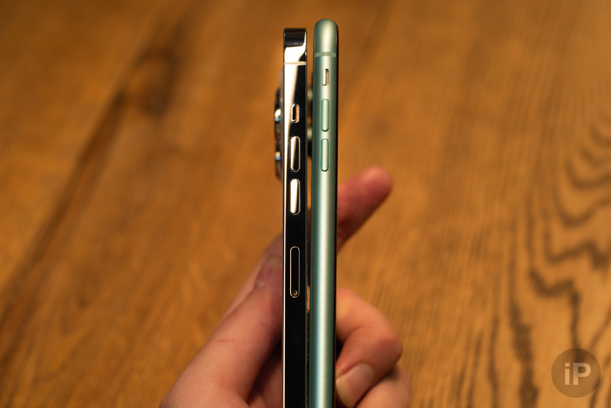 Толщина iPhone 13 Pro 7,65 мм, а iPhone 11 равно 8,3 мм, хотя второй выглядит тоньше. Но при этом новинка работает значительно дольше. Кнопки теперь крупнее и ниже, и это очень удобно
