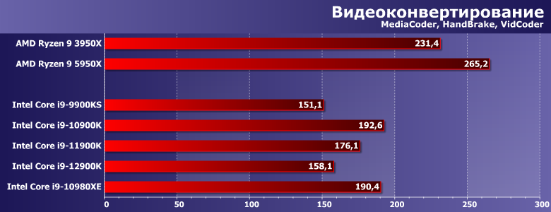 С HandBrake все нормально — с задачей 12900K справился в два с половиной раза быстрее при потреблении платформы (плата, процессор, память и немного периферия) на уровне 244 Вт. Все в полном соответствии с теорией. А вот две остальные программы судя по потреблению энергии производительных Р-ядер просто… Не получили. В итоге сам процессор укладывался где-то в 70 Вт — что нормально для двух кластеров Е-ядер. Скорость повыше, чем у шестиядерного Skylake без Hyper-Threading —, но далеко не в два с половиной раза. Но о возможности возникновения таких ситуаций особенно в «старом» ПО под управлением «старой» ОС мы выше предупреждали. Посмотрим — насколько часто это будет повторяться. «Нормальный» же результат по группе был бы в районе 250 баллов — т. е. между 3950Х и 5950Х. И быстрее любых других процессоров Intel.