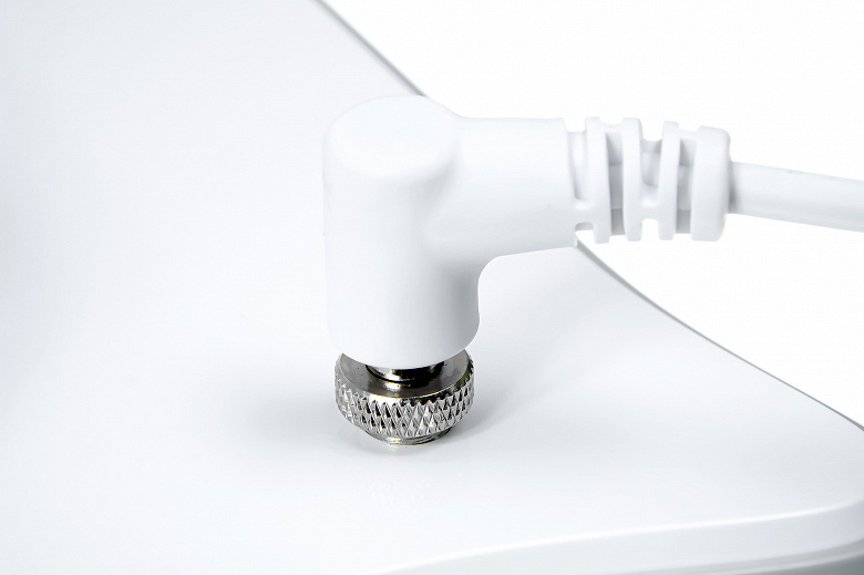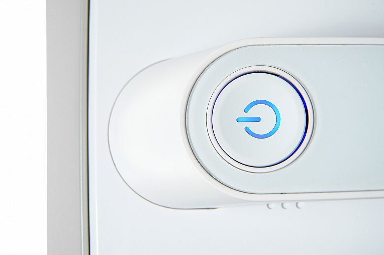 На верхней части прибора можно увидеть ручку с механической кнопкой (с подсветкой), а также разъем для подключения провода питания. Отметим, что разъем провода у нашего робота не просто втыкается, а крепится с помощью специальной гайки и резьбового соединения.